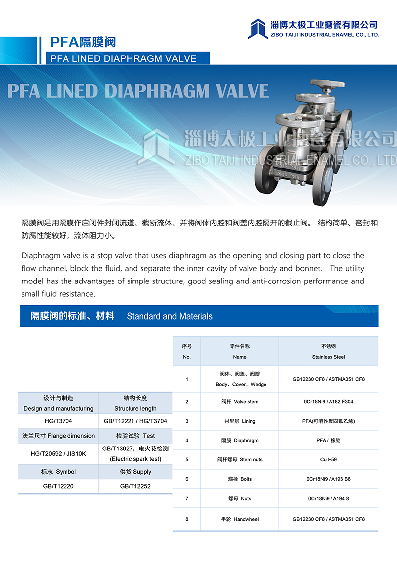 太極氟塑料PFA隔膜閥是用隔膜作起閉件封閉流道、截斷流體、并將閥體內腔和閥蓋內腔隔開的截止閥。結構簡單、密封和防腐性能較好,流體阻力小。