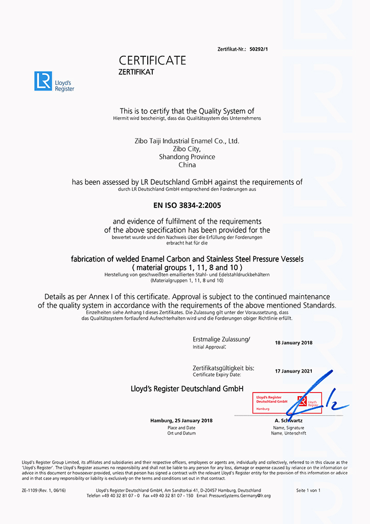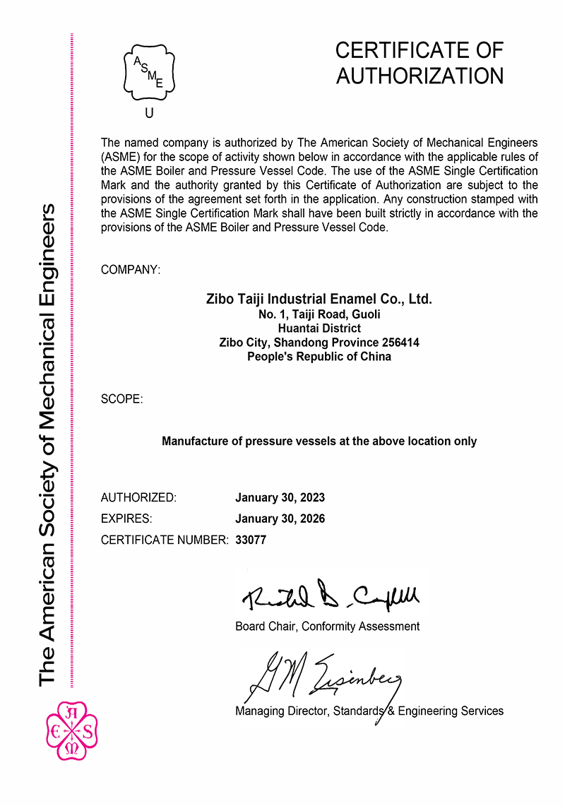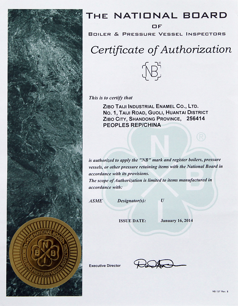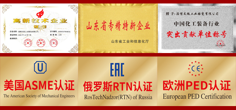 淄博太極在中國搪玻璃設備制造行業(yè)中首家通過ISO90001質(zhì)量體系認證,并擁有美國ASME認證、歐洲PED認證以及國家部門頒發(fā)的搪玻璃制造許可證、進出口許可證和百余項榮譽證以及三十六項專利等。
